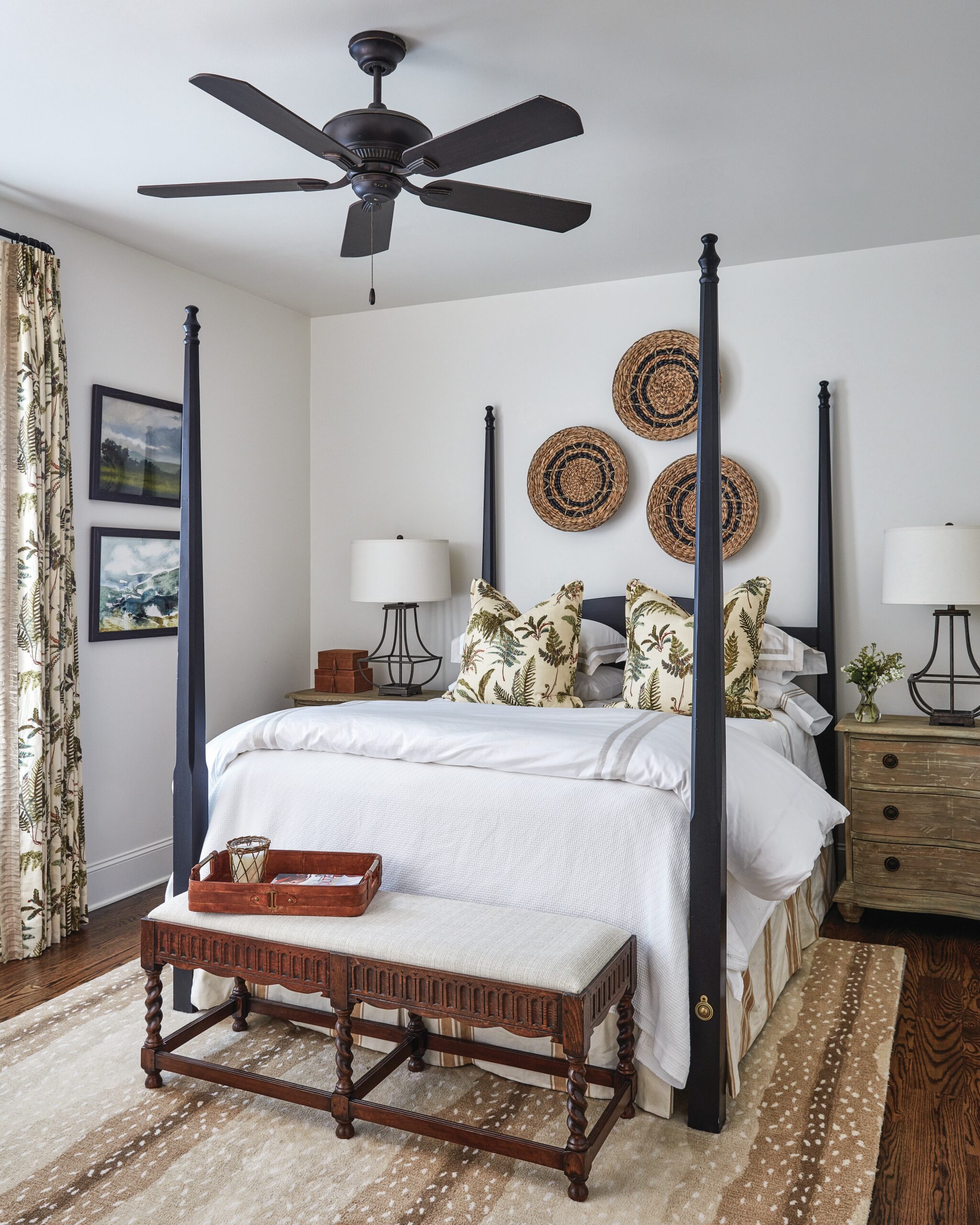 If you’re looking to add more visual interest, consider textural variety. Antique baskets fastened to the wall complement draperies and pillows done up in a classic Schumacher fern print. A grand four-poster bed adds elegance, while an antelope-print rug elevates the earthy vibe.