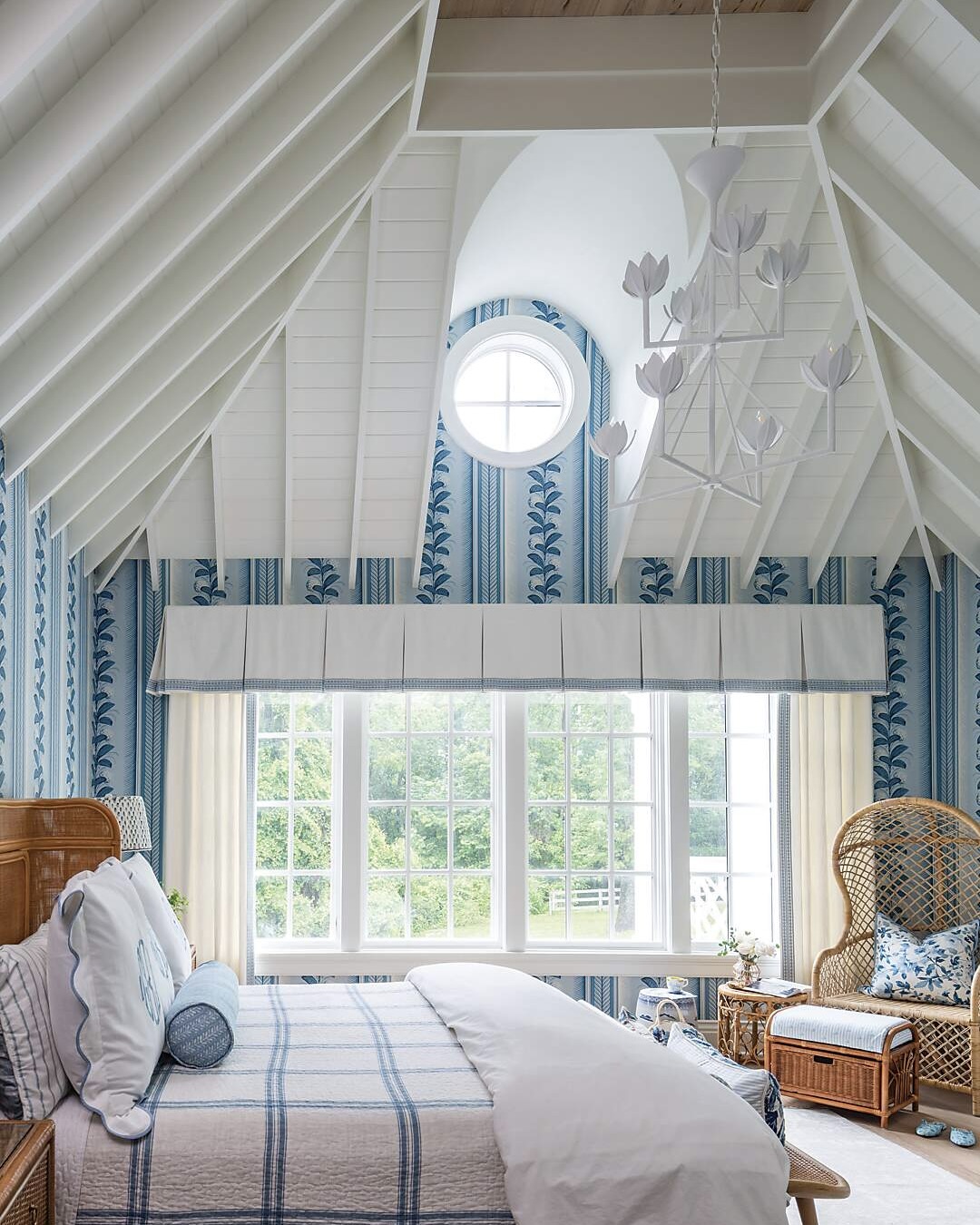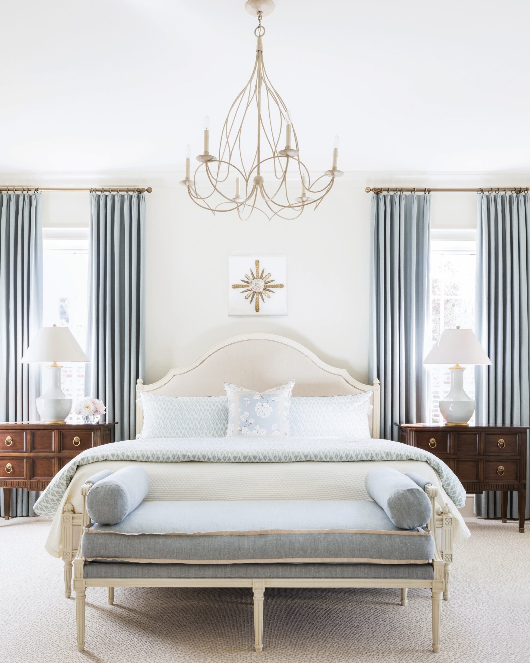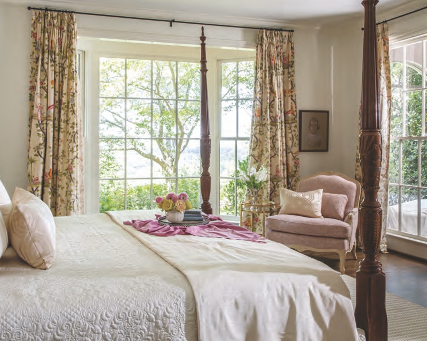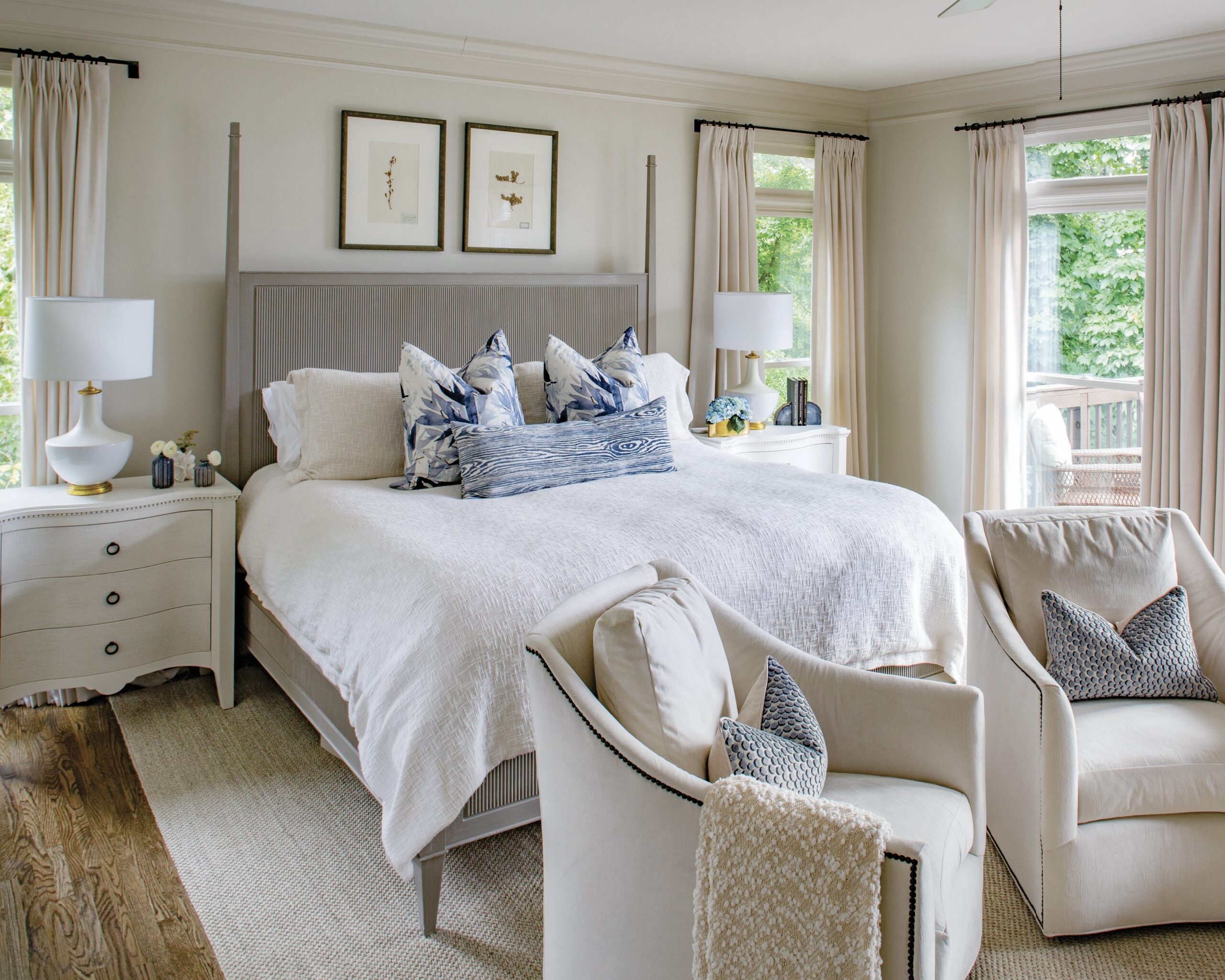 A classic color palette in this Kentucky bedroom pays homage to the Bluegrass State. “I’ve always been drawn to blue; it feels like a neutral to me,” says homeowner and designer Gretchen Black, who hails from Kentucky. She put together this stunning room in a house built by her husband, Jason Black, of Artisan Signature Homes. A rattan peacock chair adds a hint of summery flair.