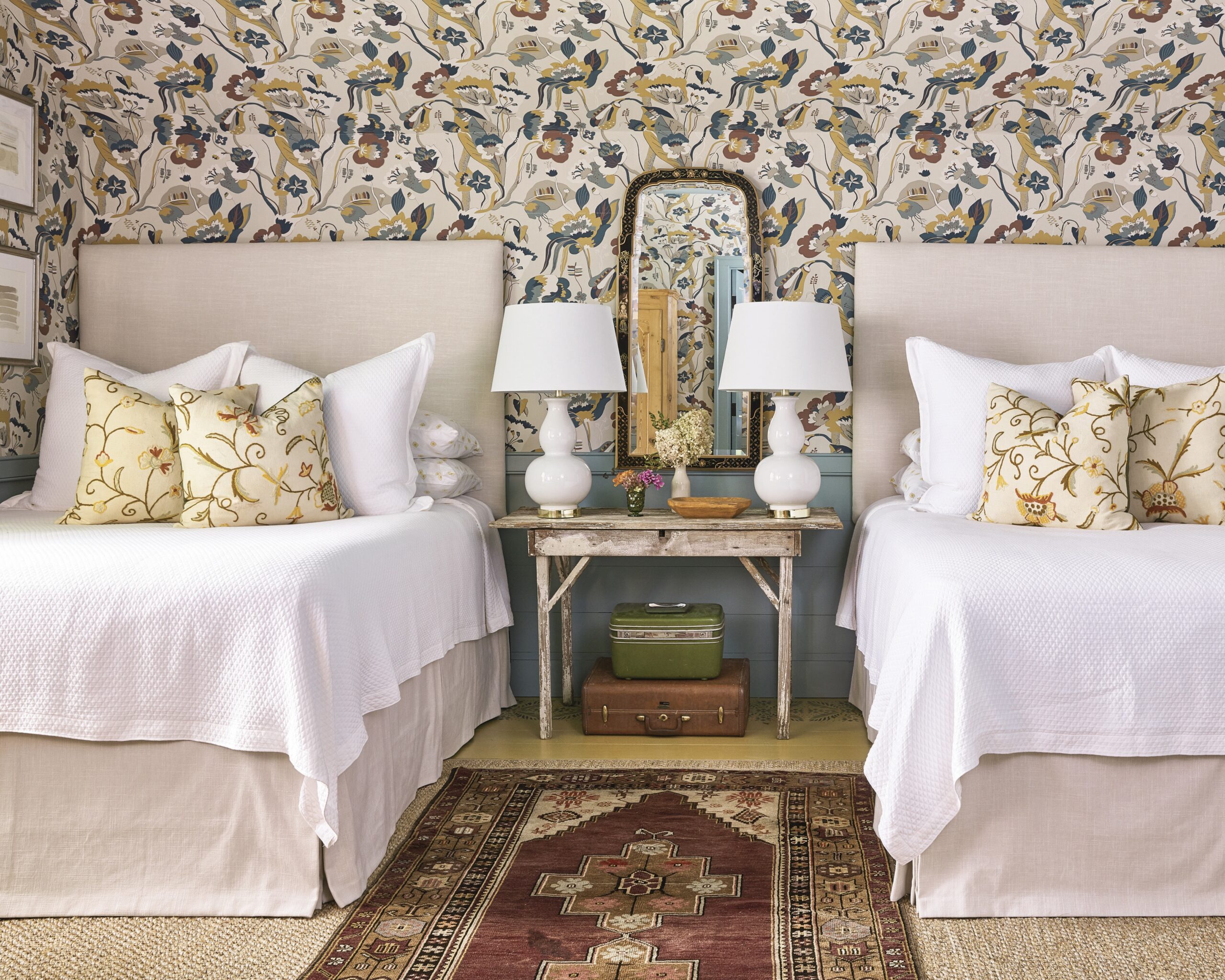 By extending an eye-catching floral wallpaper to the ceiling, designer Maggie Griffin created a comfy nook for guests staying in her cabin in Highlands, North Carolina. A few sentimental accents, including antique luggage she inherited from her great-grandparents and pillows swathed in a vintage crewel textile, lend even more charm.