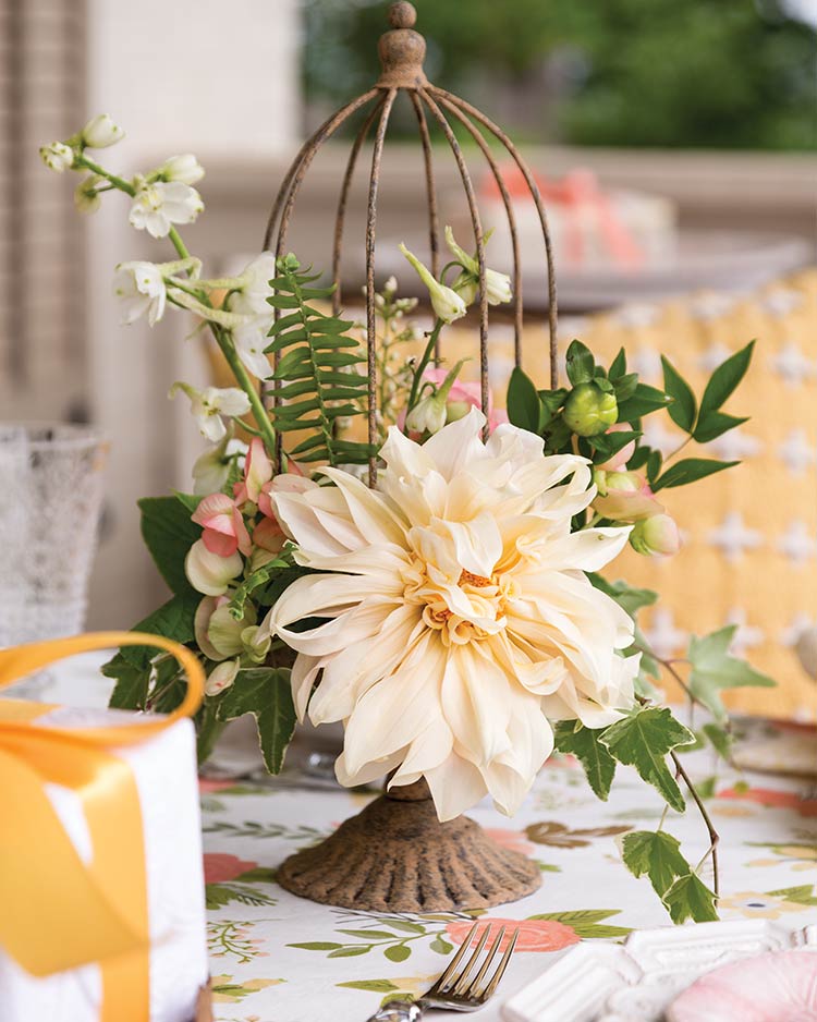 A decorative bird cage with a gentle patina takes on a fresh look when embellished with ivy, fern fronds, begonias, and a single peach-tinted dahlia. It’s the perfect top note for a birthday party on the veranda.