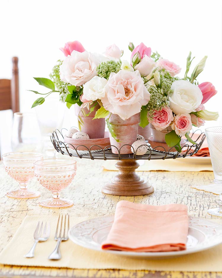 Lush blossoms and greenery tucked into petite terra-cotta pots mingle with painted faux eggs on a pastry stand for a vignette that celebrates the season of grand awakening.