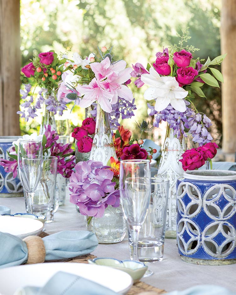 For a party on the patio, mix azaleas and other garden clippings with pretty store-bought blooms in a cluster of decorative glass bottles that vary in height, shape, and size.