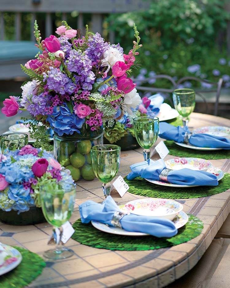 Create a captivating centerpiece that harmonizes with the tablescape’s color scheme. This towering arrangement of hydrangeas, tulips, delphinium, ranunculus, and more, is nestled into a vaseful of bright limes.