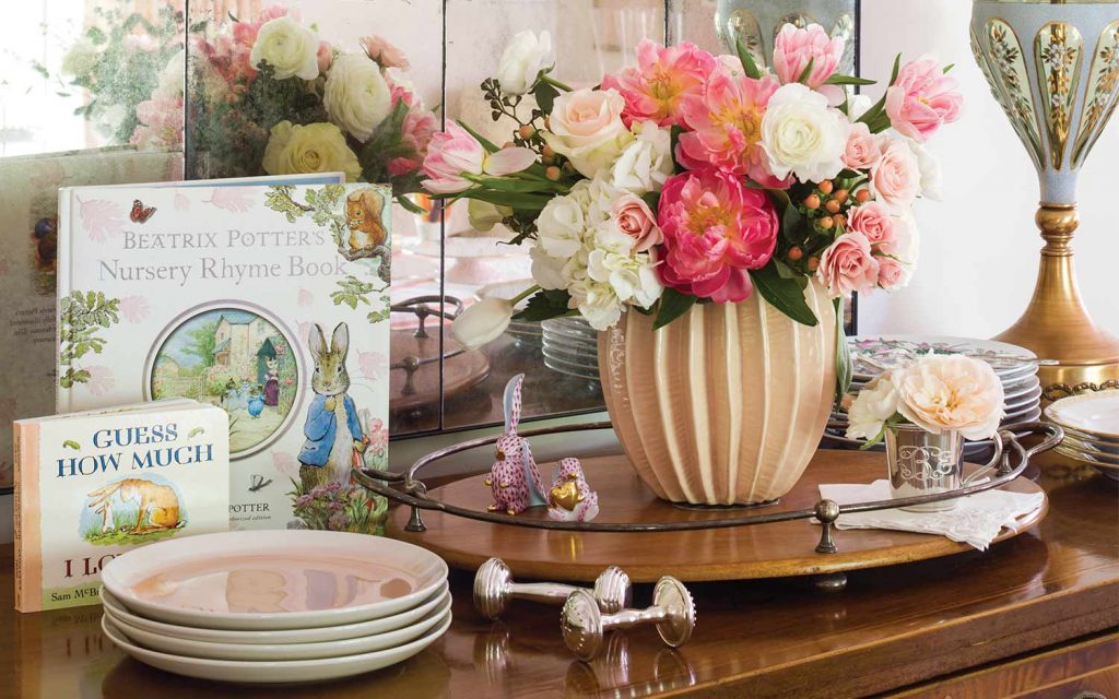 Lovely blooms in a spectrum of pinks and white, interspersed with hypericum berries, are idyllic for a baby shower, especially when posed amid treasured trinkets and books.