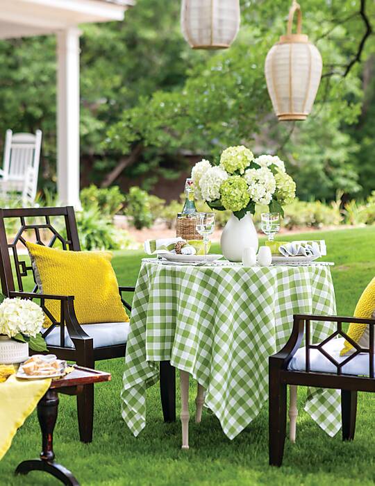 Outdoor table decorated with yellow, green, and white accentsReady an alfresco table for two by borrowing from summer’s primary paint box.