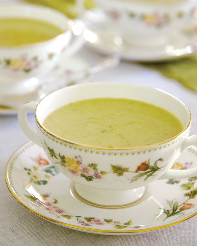 - In a Dutch oven, heat butter and olive oil over medium heat until butter is melted. Add asparagus, onion, celery, and garlic; cook for 8 minutes, stirring frequently. Add wine; cook for 2 minutes. Add flour; cook, stirring constantly, for 2 minutes. Gradually add chicken broth, whisking until smooth. Bring to a simmer, reduce heat to medium-low, and cook for 20 minutes, stirring occasionally. Remove from heat, and cool slightly.