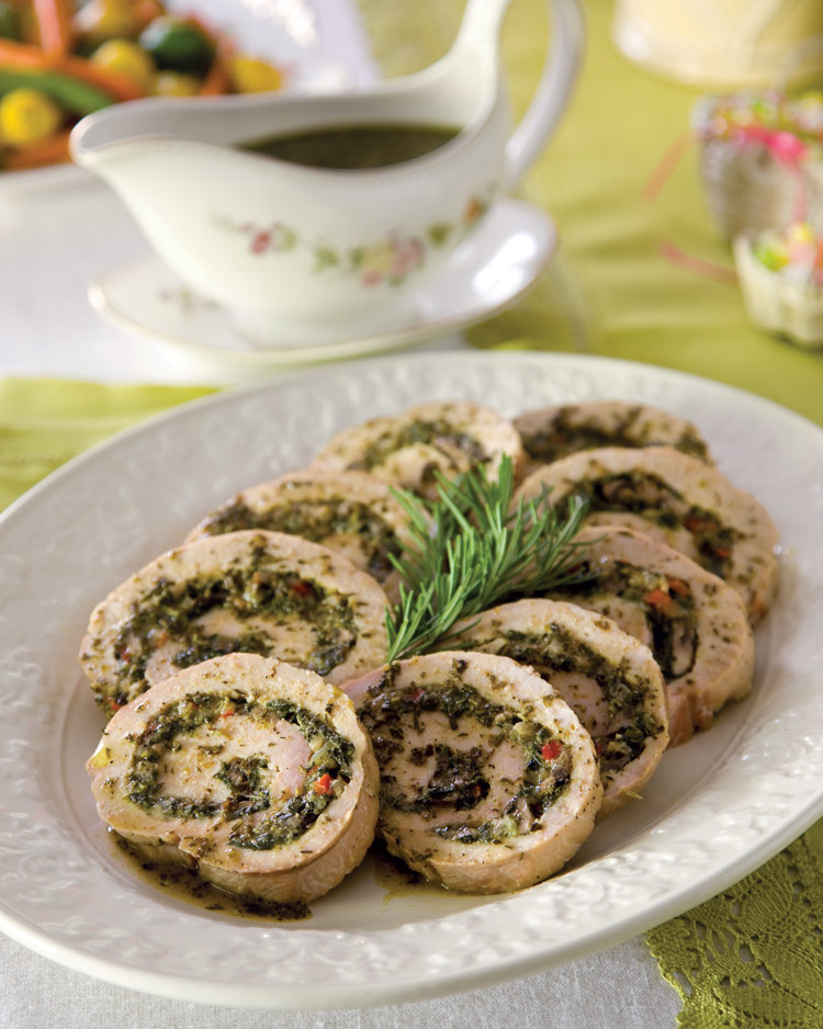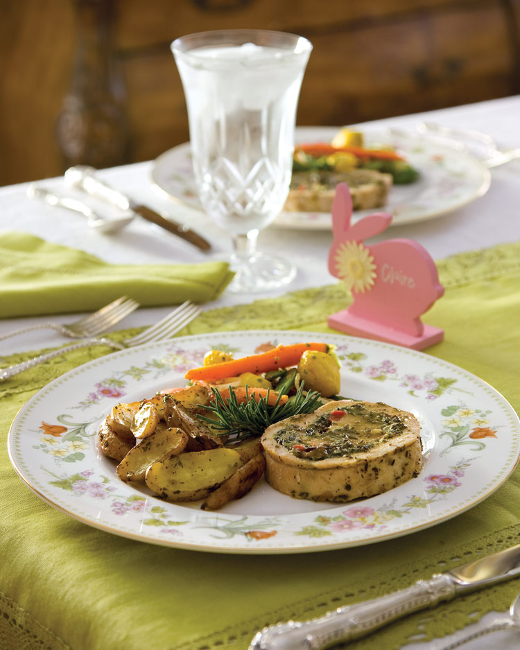 This cheerful scene begins with a basic white tablecloth and cherished heirloom china. At each seat, speckled eggs piled in a cream-soup bowl are a welcoming sight, and over on the sideboard, a big, beautiful cake adds to the spirit of fun and frivolity. A pastel palette and a garden-fresh menu put an array of delights on the table, with Creamy Asparagus Soup, a Spring Vegetable Medley, Spinach and Mushroom Stuffed Pork Loin, and Garlic Roasted Fingerling Potatoes all among the offerings. For dessert, a slice of Tropical Coconut Cake is the ideal sweet note for this completing happy gathering. When paired with the cheerful decor, this Easter menu is sure to give you an ideal setting for celebrating with loved ones.
