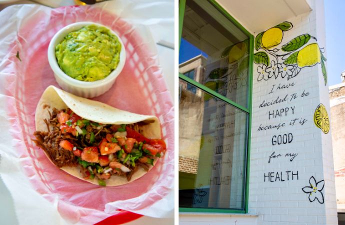 At Taqueria del Sol (left), tacos and Tex-Mex classics are served up with a Southern twist. Flavorful salads, grain bowls, and wraps are packed with organic produce and fresh flavors at Flower Child café (right).