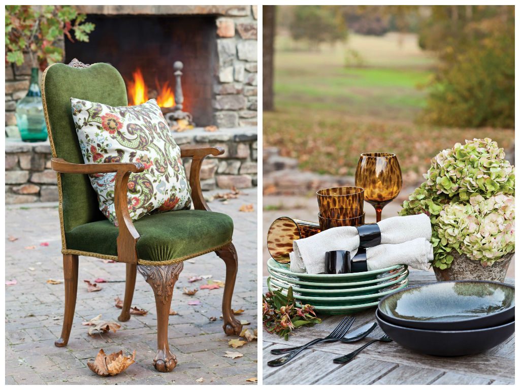 Autumn holds such allure, with picture-perfect weather and a colorful swirl of fiery hues all across the landscape. Take advantage of this incredible season by enjoying a meal on the patio. Bring out a rustic table, and dress it up with velvet-upholstered dining chairs. A selection of glazed dinnerware in the Jars Tourron collection anchors the setting, and its rich, earthy hues pair beautifully with shiny black flatware, black horn napkin rings, and tortoiseshell-patterned glasses. Complete the setting and serve our fall salad with molasses vinaigrette and peanut butter tart