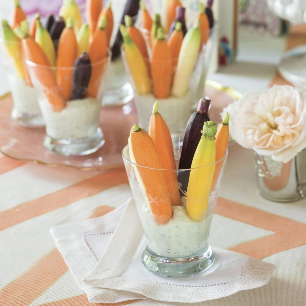 A creamy dip bursting with the flavors of fresh parsley, dill, and green onion pairs perfectly with petite rainbow carrots.