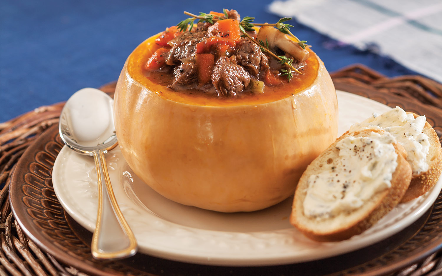 Dinner Dressed Up October 17, 2018 FacebookTwitterPinterest Beef Stew with Red Wine and Mushrooms in Butternut Squash Bowls
