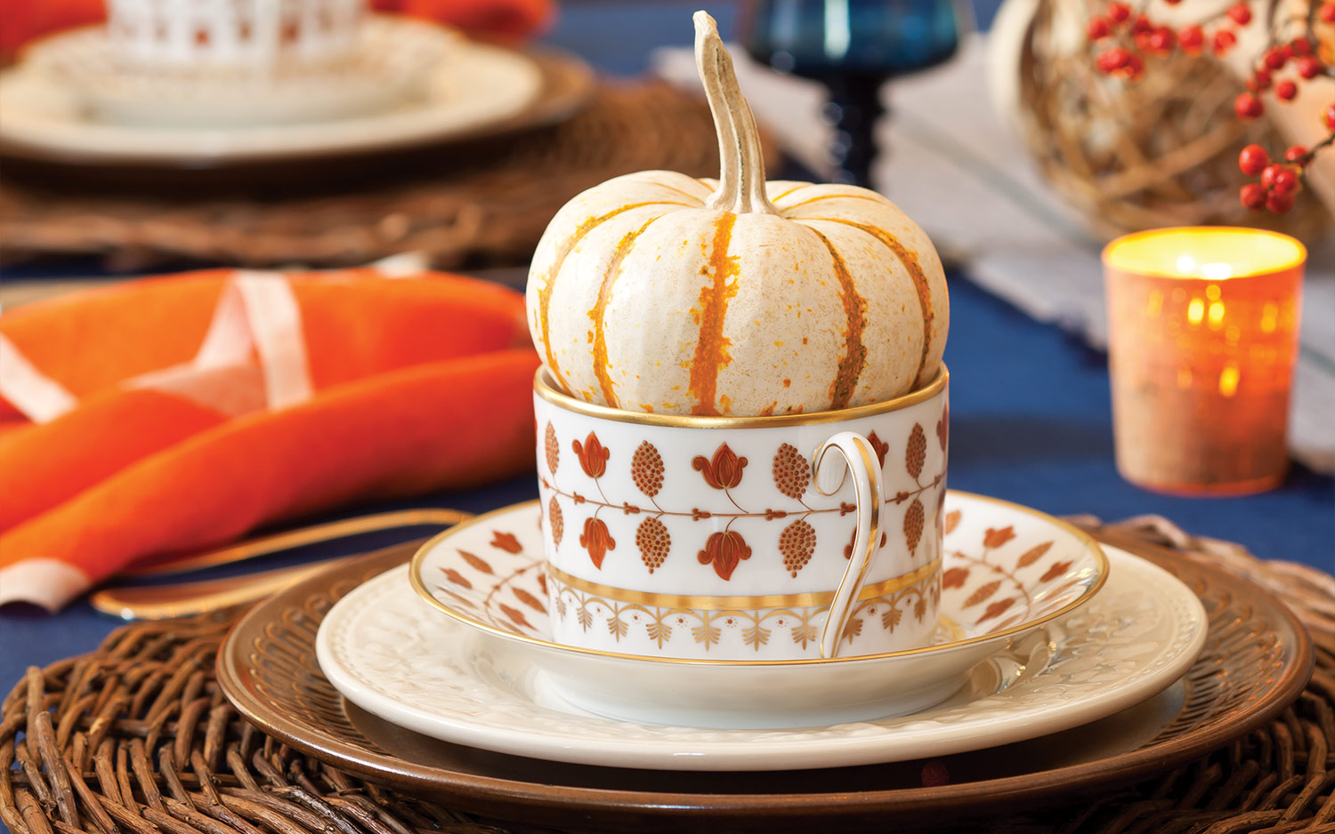 Pennine Dinner Plate by Wedgewood, Sherwood Oak Salad Plate by Royal Stafford, Matignon Rust Dessert Plate, Bread & Butter Plate, Breakfast Cup & Saucer, and Tureen by Chas Field Haviland, Richmond Blue Water Goblet by Colony, and Beaded Antique Gold Stainless Flatware by Towle; Replacements, Ltd. Hemstitch Tablecloth in Navy, Khadi Linen Runner in Navy, and Laundered Linen Napkin in Orange/Natural Stripe; Couleur Nature. Beaded Napkin Rings and Woven Chargers; At Home Furnishings. Green Mirror and Haystack Topiaries; Tricia’s Treasures.