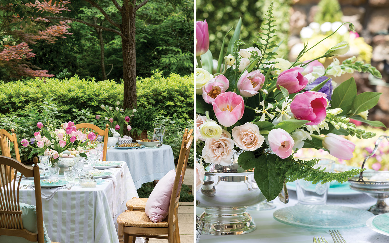 Dainty floral motifs abound, from timeless crystal patterns to an assortment of unique glass dinnerware in turquoise hues. A lively arrangement of tulips, snapdragons, and ranunculus spills from a refined silver vessel, adding to the cheer. Extend the color and presentation by filling smaller pedestal displays with Jordan almonds and Easter eggs.