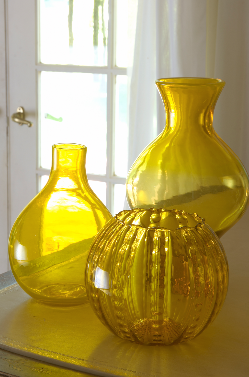 A beaming collection of yellow glassware, such as Jan’s personal collection of Murano glass shown here, illuminates and embellishes an otherwise dark corner. Group varying sizes of these vases to create a simple yet playful vignette.