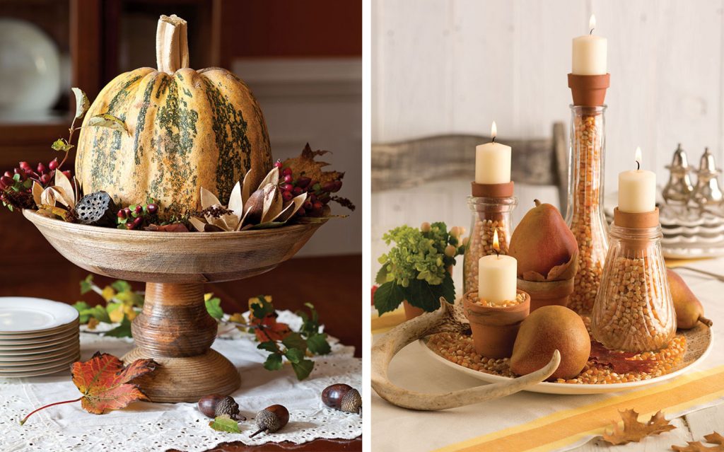A cozy autumn evening around the fire is made even merrier with a nice big bowl of popcorn. Let’s face it—popcorn is fun. But who knew this delightfully salty treat in its unpopped state could also be refined? Stylist Tracey MacMillan Runnion created a unique—and decidedly doable—centerpiece that starts with pouring popcorn kernels into a large, shallow bowl. Next, fill glass bottles of varying heights with more kernels, and place them in a pleasing arrangement in the bowl. Mini terra-cotta pots act as “stoppers” atop the bottles, and a votive candle is nestled in each pot. To finish off this clever fall display, add a few fall pears and another terra-cotta pot of flowers.