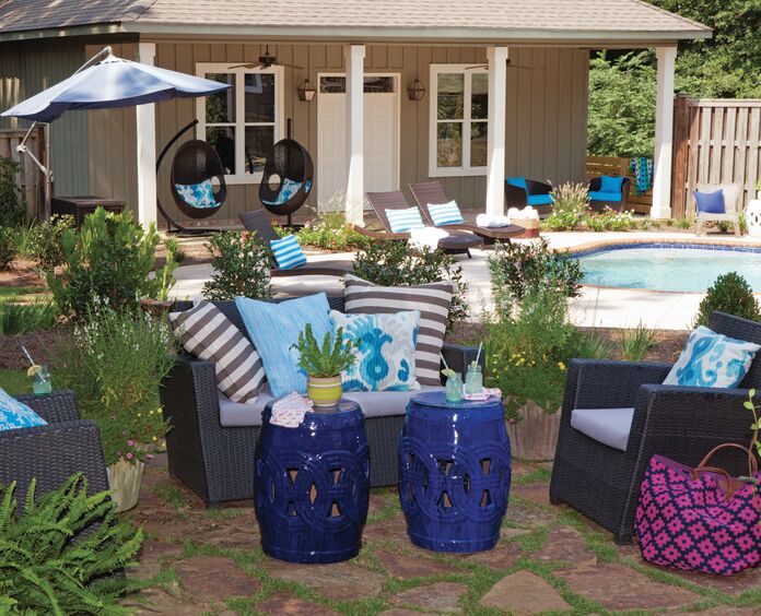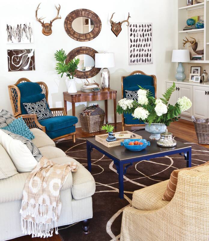 Some of Jeramy’s favorite pieces are ones she grew up with in her Mississippi childhood home, including bamboo chairs that lend personality to the living room. “I brought the chairs into the 21st century with a peacock-blue velvet that could weather three kids, two dogs, and plenty of pool traffic,” she says.