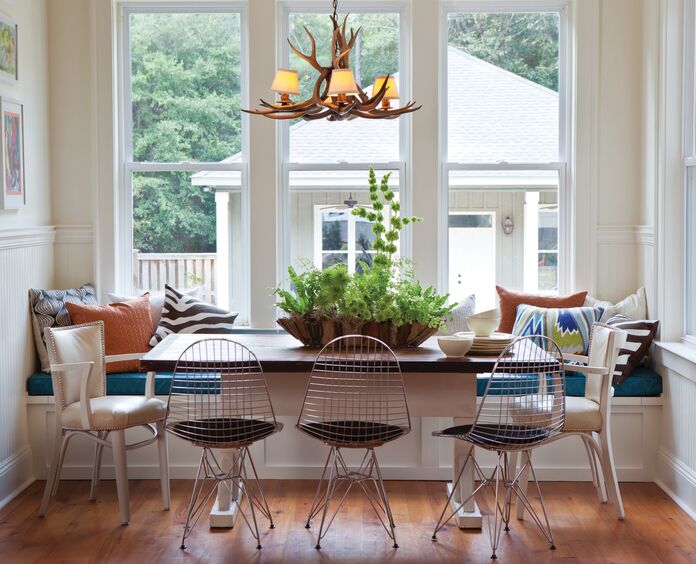 With its mingling of stylish fittings and familial accents, the breakfast nook at Jemmy Neill’s Fairhope, Alabama, home exemplifies her approach to design. Jeramy’s handy husband built the impressive banquette, which provides both extra entertaining space and additional storage. Assorted pillows add color and pattern and tie into the rainbow of framed kids’ art hanging on the wall.