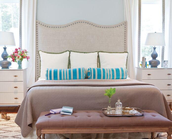 Throughout the master suite, splashes of ocean blue nod to the home’s coastal setting. Jeramy’s husband designed and built the linen-upholstered headboard trimmed with silver nailheads.
