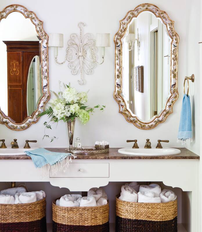 Ornate his-and-hers mirrors steal the show in the master bathroom, while baskets of towels combine style and function by hiding unsightly sink pipes.
