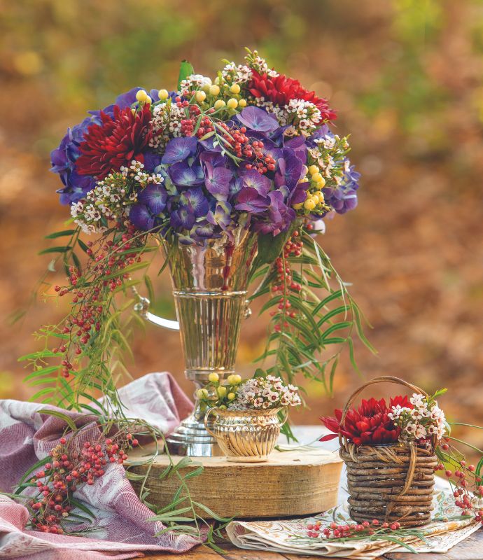 The slender silhouette of a silver trumpet vase creates an eye-catching base for jewel-toned blooms like hydrangeas and chrysanthemums. Floral foam anchors the focal flowers, along with waxflower, hypericum, and wispy pepperberry branches.