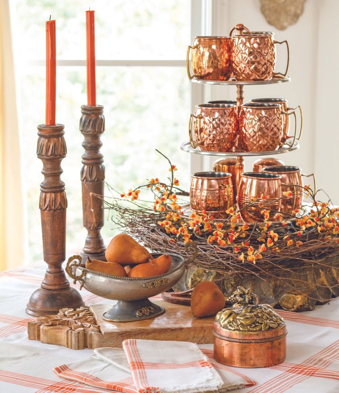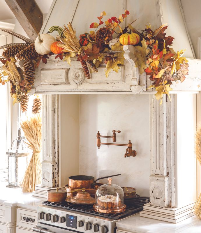 The gracious spirit of fall easily extends to the kitchen. For a rustic look, pair wooden pieces with copper and pewter elements; their burnished patina brings warmth to organic elements with a flat finish.