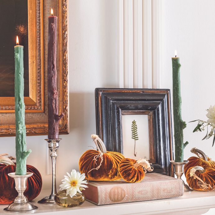 Update your mantel with chic seasonal finds, such as velvet pumpkins and branch-style candles in pewter candlesticks at varied heights.