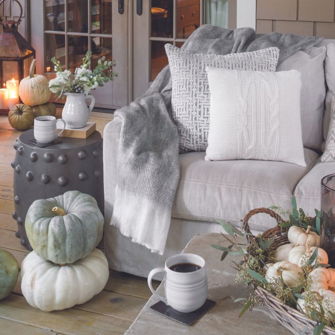 A muted palette garners a fall feel with stacked heirloom pumpkins, a soft plaid blanket, and a basketful of ‘Baby Boos.’ Flickering candles inside hurricane lanterns brighten the scene set for morning coffee with a view.