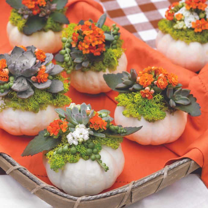 Succulents take the spotlight with these jaunty arrangements. Using hot glue, affix moss atop mini pumpkins to create a decorative bed for rosette-shaped echeveria, orange and white kalanchoe, and string of pearls sprigs. Arrange them on a tray, or put one at each place setting to bring heartfelt smiles.