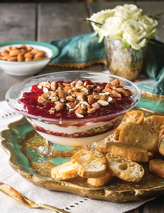 - In the bottom of a 12-ounce glass bowl, spoon and spread one-third of goat cheese. Spread 1½ tablespoons jam onto cheese, and sprinkle with one-third of almonds. Repeat layers twice.