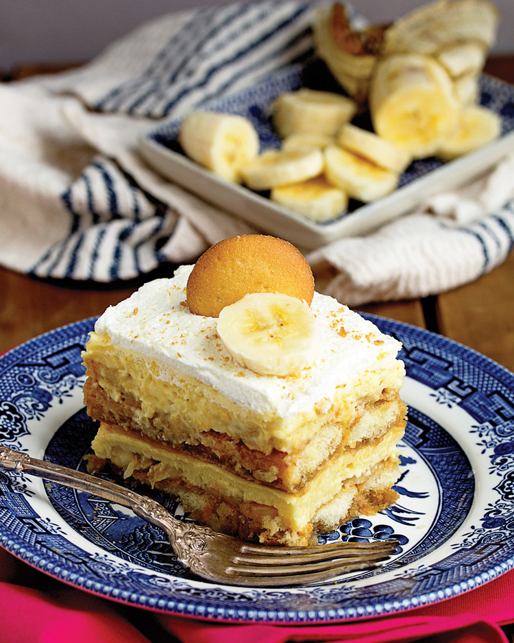 6. Repeat with another layer of the remaining ladyfingers and sauce, the slices from 2 bananas, and the remaining filling. Top the cake with the remaining whipped cream. Smooth the cream out over the cake. Garnish with the crumbled vanilla wafers and slices from 1 banana.