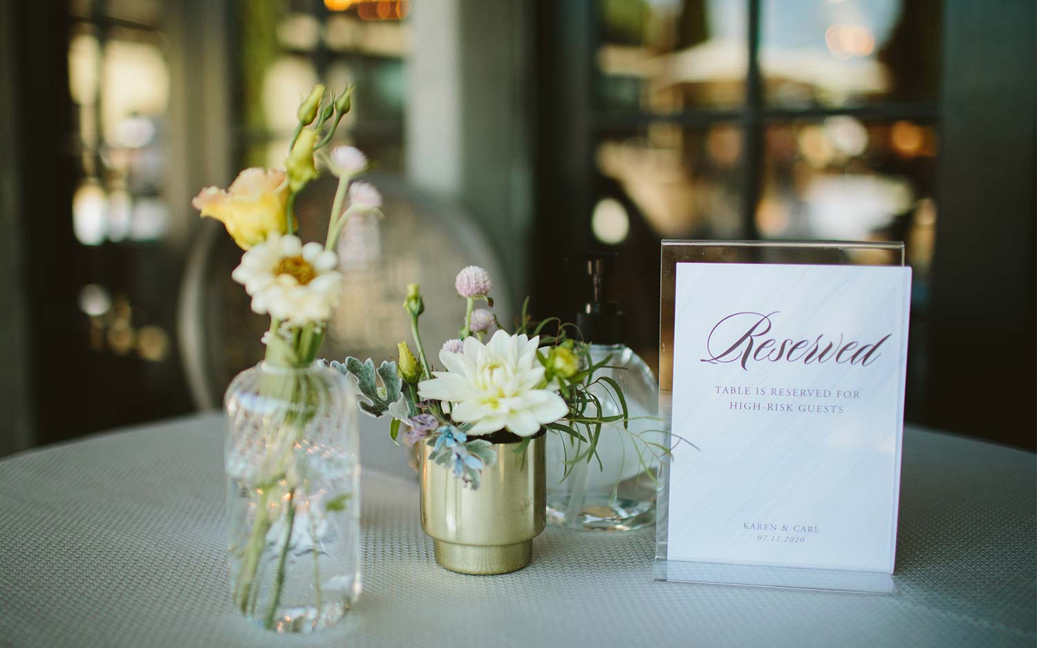 To remove any guesswork, Greg recommends asking guests about their seating preferences in advance and assigning spaces with place cards based on responses. You can also reserve more secluded areas for high-risk guests. Emily Painter, founder of Palm Beach-based Freshly Set, adds that round tables can help. “The diameter spreads you out but still makes conversation easy and fun,” she explains. Also, use fewer chairs than each table accommodates.