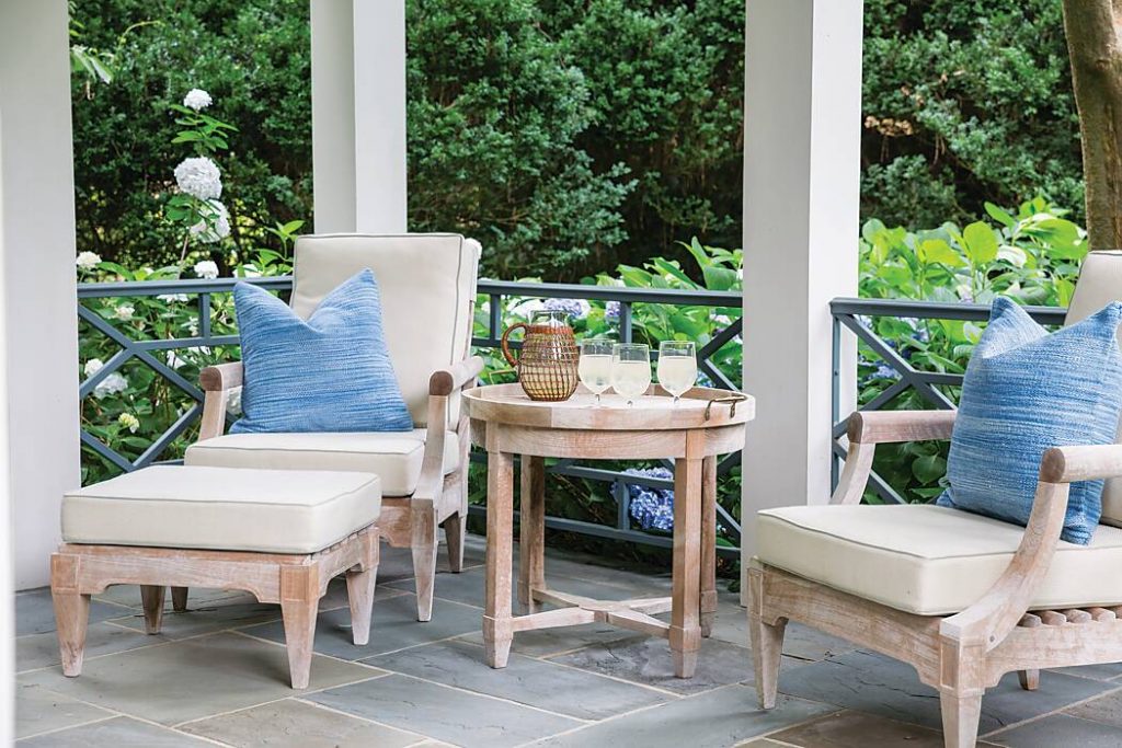 The large aqua pool with wide coping and a grass deck is enhanced by a captivating pavilion, designed by renovation architect James Carter of Birmingham and furnished with comfortable chairs for poolside relaxation. Flowering plants of the South like hydrangeas, dogwoods, quince, and more unfurl their full color in summer to provide the perfect accent at the entrance to the covered area.