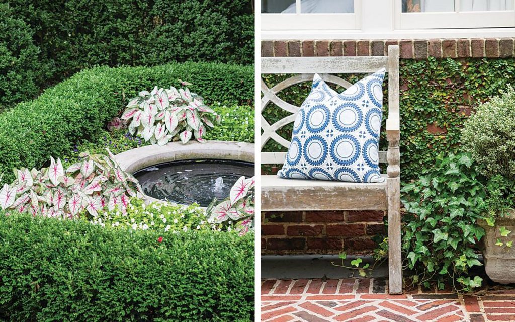 He used several types of stairs to allow seamless movement through the grounds. Along the way, boxwoods, mondo grass, and strips of lawn create lush green areas, setting a soft, tranquil tone that plays against mid-height evergreen hedges and the towering magnificence of century-old trees.