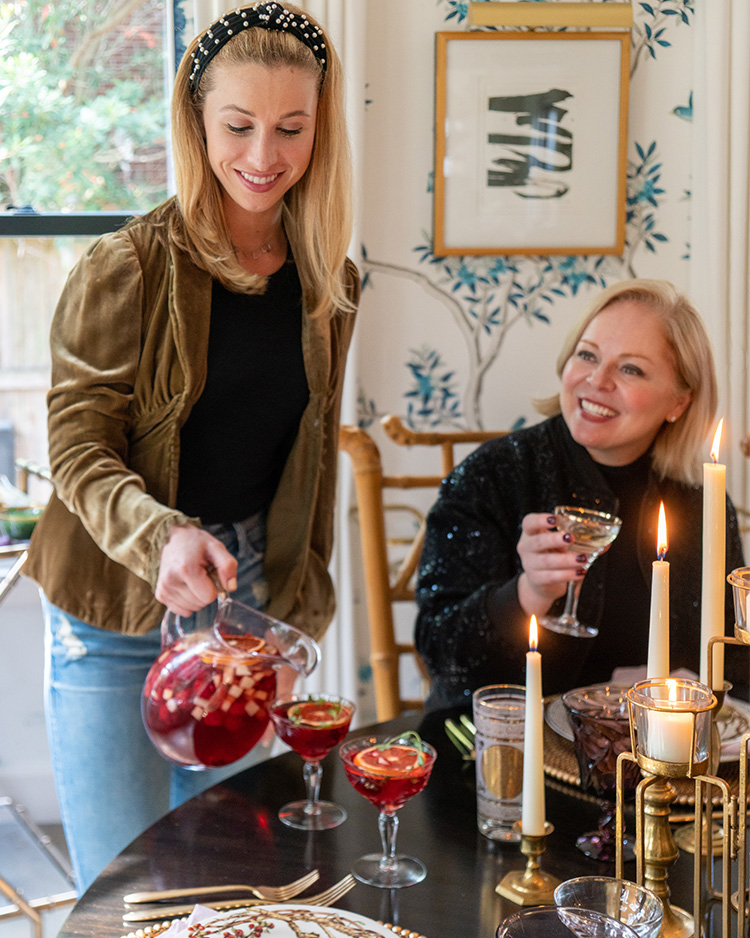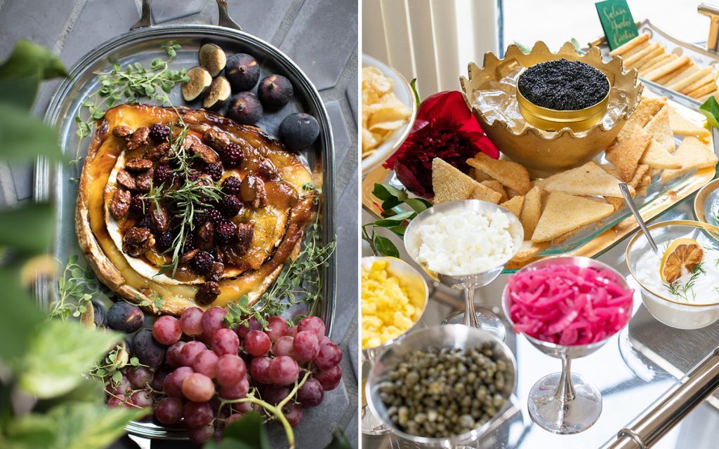 A satisfying array of sippers—Apple Cider Sangria Spritzers, Blackberry Coulis & Sage Mojitos, and Mulled Wine—kicked off the get-together with a fresh twist. Savory hors d’oeuvres like Baked Brie and Moroccan Meatballs keep company with a fanciful Caviar & Smoked Salmon Presentation set on a vintage bar cart with an etched bamboo design.