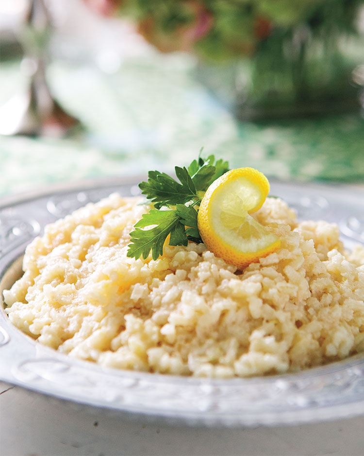 - In a large saucepan over medium heat, heat 1½ tablespoons butter and olive oil until melted. Add green onions; sauté for about 4 minutes or until soft (but not browned). Add rice; stir until evenly coated in butter-and-onion mixture, about 1 minute. Add 1¾ cups hot chicken broth, and stir until liquid is absorbed. Continue to add broth, ½ cup at a time, allowing liquid to be