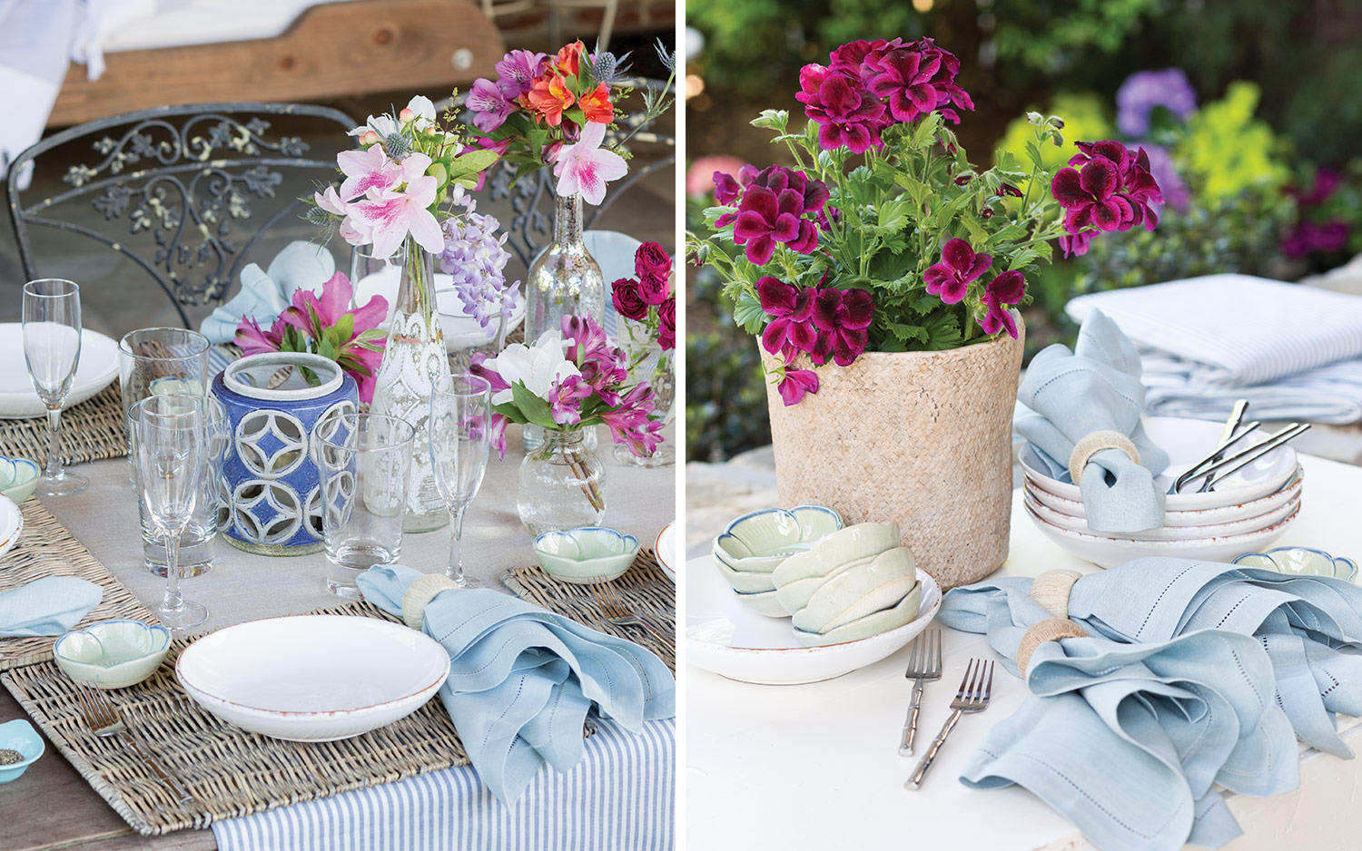 Treat the happy couple to a fête that exudes the simple beauty of a love truly meant to be. Craft a sense of casual elegance using basic dishware and airy linen fabrics in white and blue to highlight the occasion. For no-fuss flowers, mix azaleas and other garden cuttings with pretty store-bought blooms in clusters of glass bottles.