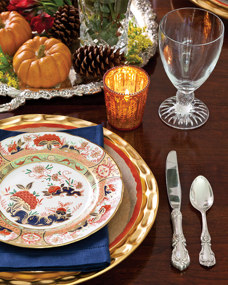 Festival Napkin in Navy; SFERRA. Reed & Barton Burgundy 4-Piece Dinner Size Place Setting; Replacements, Ltd. Waterford Town & Country Riverside Drive Wine Glass; Bromberg’s. Truro Gold Charger; Michael Wainwright. Royal Crown Derby Imari Accent Imperial Garden Salad Plate; Gracious Style.
