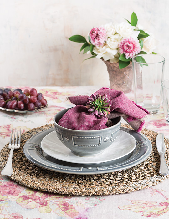 Here, nestled between a dove gray embossed dinner plate and matching bowl, the plate pairs with a floral tablecloth, bestowing an air of French country elegance. A succulent napkin ring adorning a fringed magenta linen tops the look with playful style, while a natural woven placemat adds a dash of insouciance.