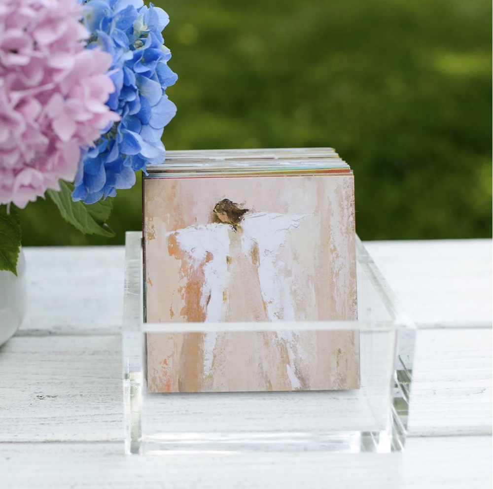 100 Days of Scripture features 100 4 x 4-inch scripture cards nestled in a versatile lucite box for displaying your cards either flat or vertically. Each card includes an Angel image on one side and a scripture verse on the other.