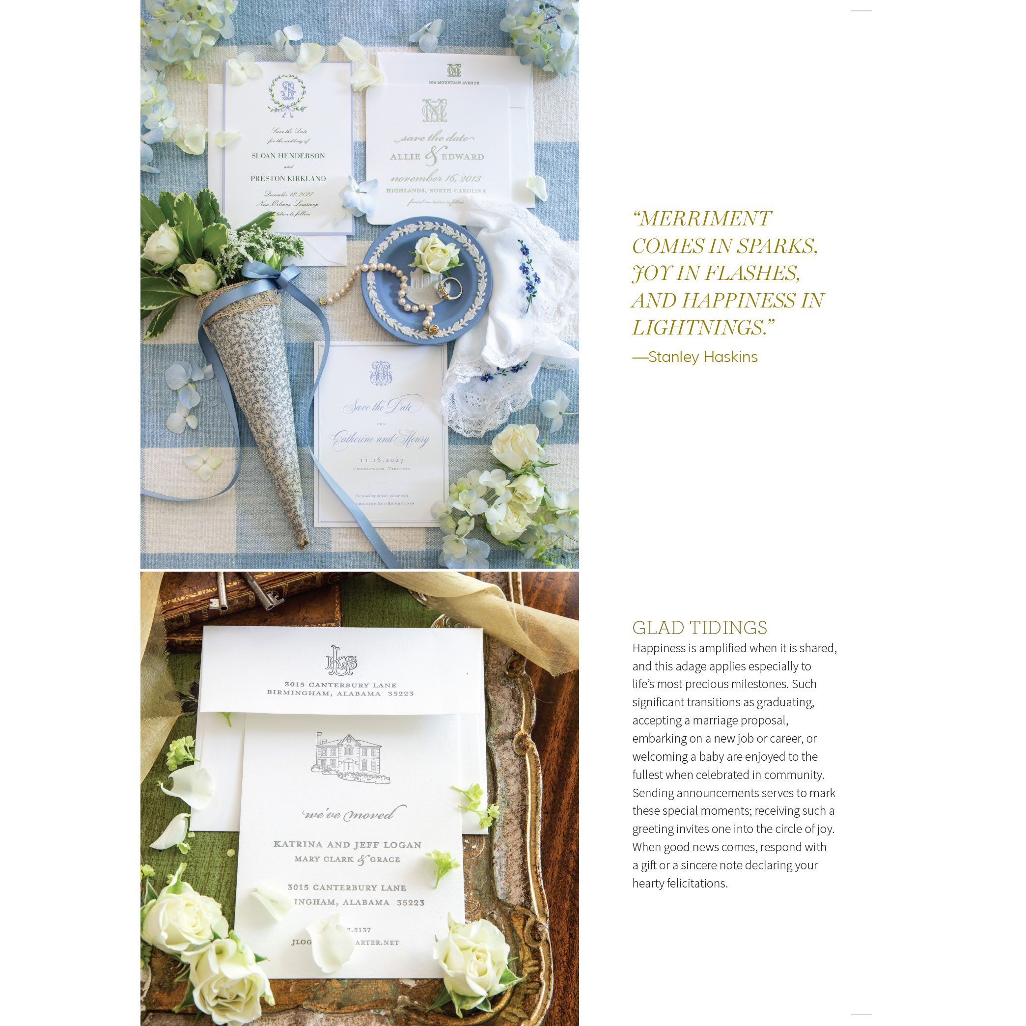 The Art of Correspondence: Like satin streamers unfurled back and forth across the miles, missives exchanged over the course of time tug gently at the heartstrings, pulling loved ones closer as each handwritten note further entwines the lives of sender and receiver. Reflecting on the beauty of pouring one’s deepest feelings onto the page, The Art of Correspondence offers inspiration for creating meaningful connections through writing letters. With personal essays on the value of this practice, features highlighting exquisite accoutrements, and tips for expressing one’s thoughts in every situation, this book will delight and inform.