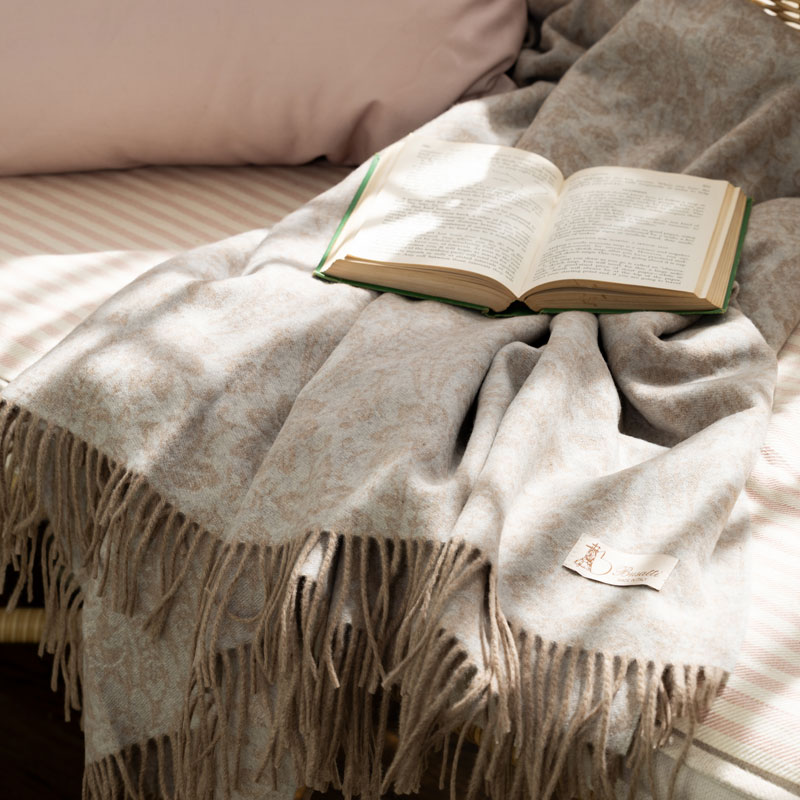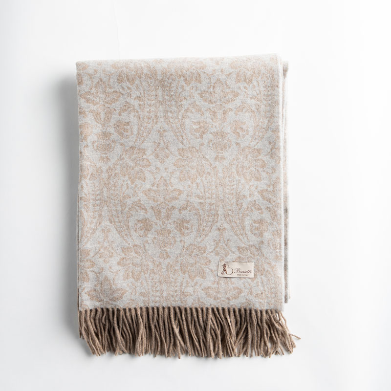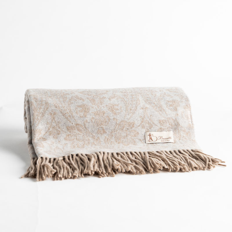 Made from high-quality virgin wool, this beautiful wool blanket is woven with Busatti’s popular Donna di Coppe pattern. Finished with a decorative fringe, this cream-colored throw will bring warmth, texture, and timeless elegance to any space. It’s perfect for draping over a sofa, layering at the foot of a bed, or cozying up on cool evenings. Crafted with exceptional attention to detail, it’s a luxurious, heirloom-quality piece designed to be cherished for years to come. For more than 180 years, the Busatti family has been weaving fine linens in the heart of Tuscany, and we’re honored to share this exquisite old-world craftsmanship with you.