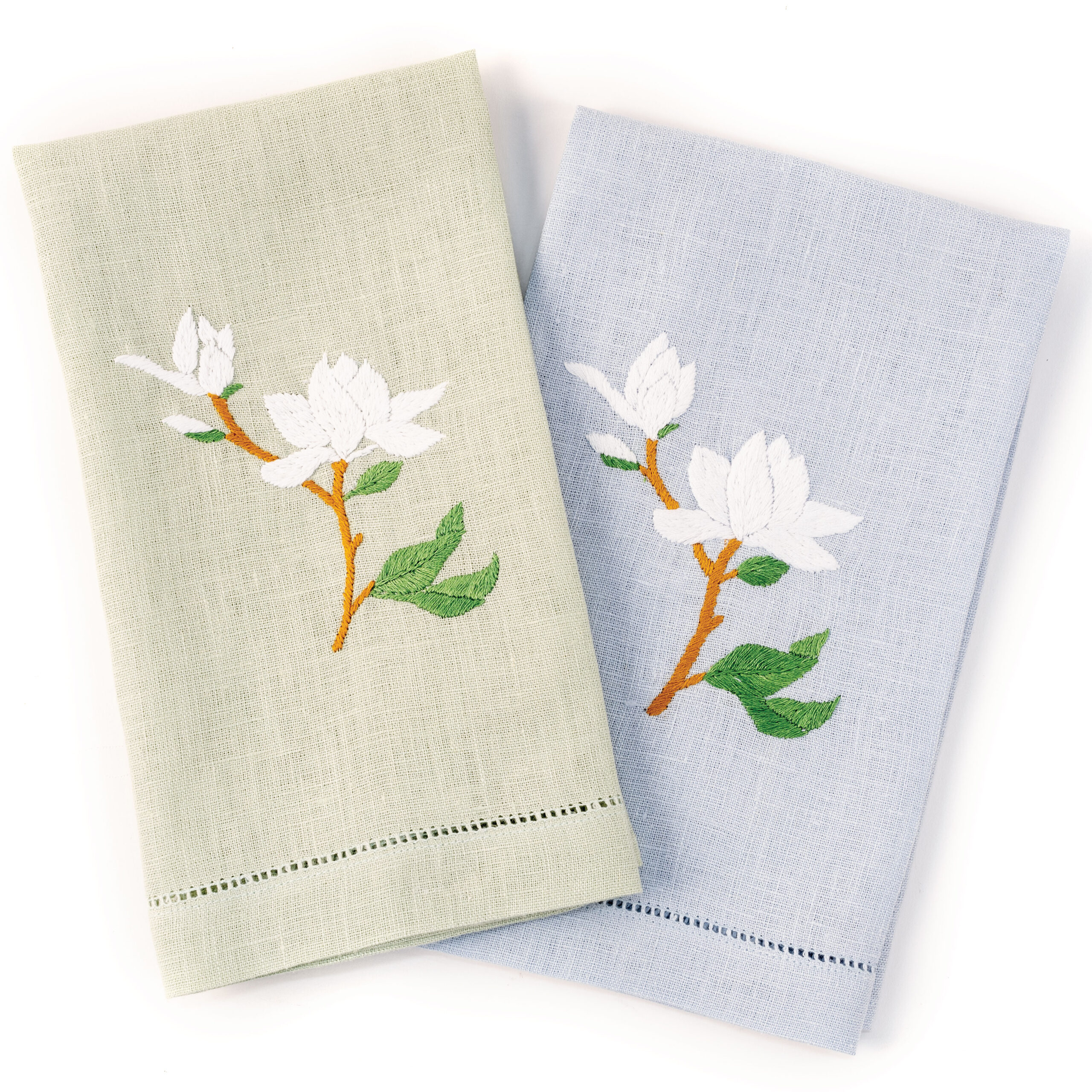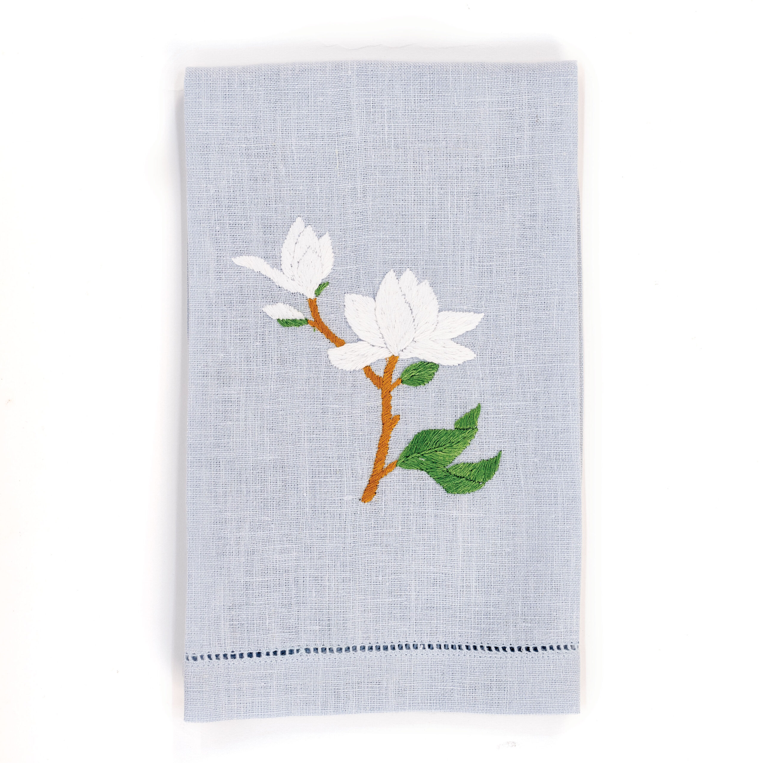 Magnolia Towel: These unique Magnolia Towel – Blue and Green hand guest towels are perfect for any special occasion. Expertly hand embroidered for a luxurious finish, this one of a kind piece is an elegant addition to any home.