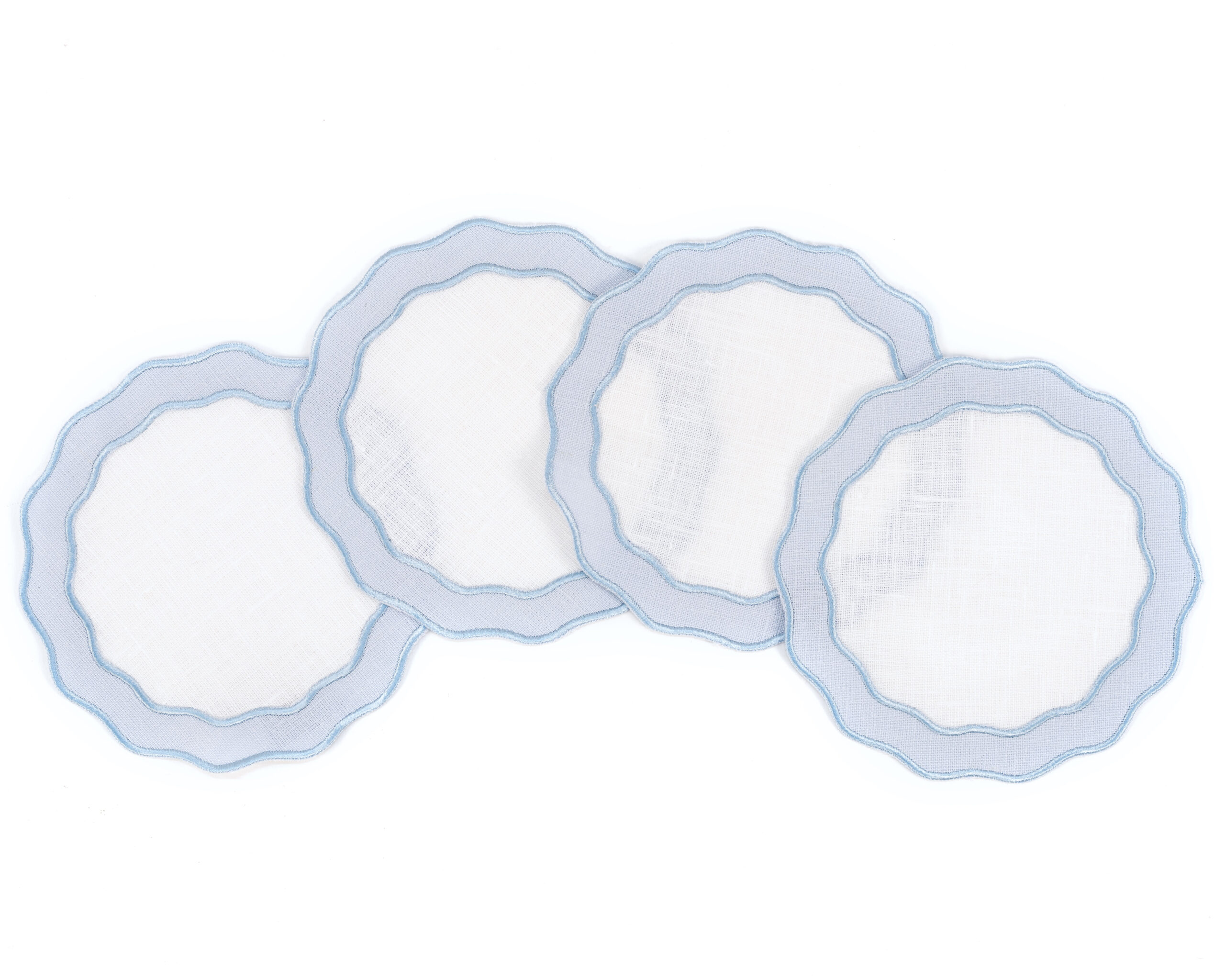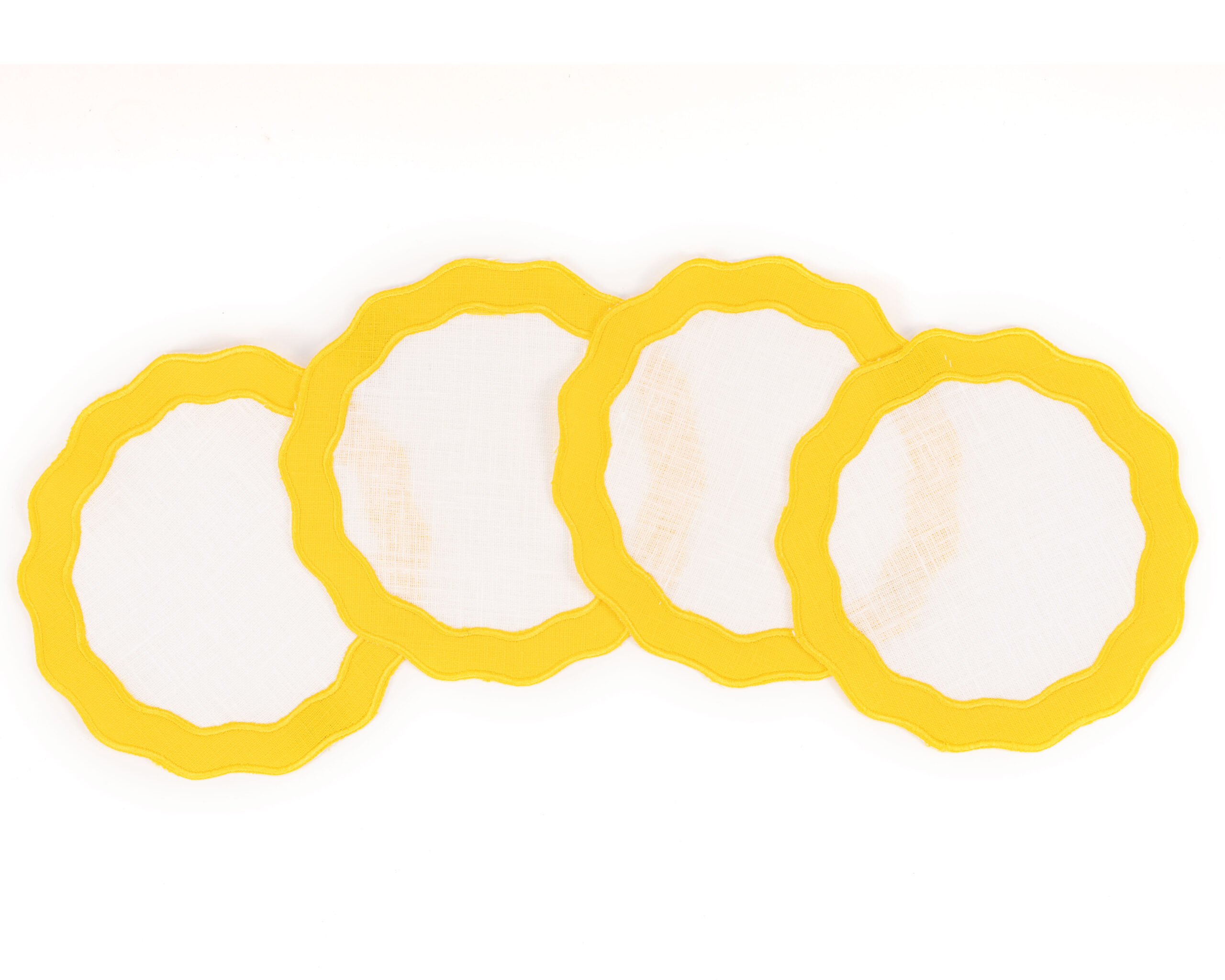 Round Cocktail Napkin: One of Hibiscus Lines best-selling styles! These 100% linen cocktail napkins have a gorgeous, delicate appliqué border and are available in a range of colors to compliment any season. Purchase colors in sky and sunflower. Product Detail: 100% linen. Sold in a set of two.