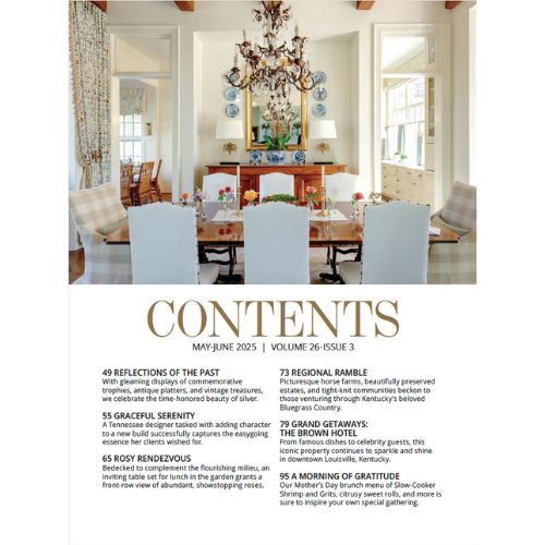 As you make your way through our May/June issue, you’ll find yourself immersed in the rich culture and distinctive charm of the Bluegrass State, where beauty knows no bounds. Whether fashioning an unforgettable look for Derby festivities or meandering along the scenic Bourbon Trail, we’re sharing a plethora of reasons to explore Kentucky this summer. History and plush elegance intertwine at Louisville’s iconic Brown Hotel, while The Southern C founders guide us through lively Lexington. Our antique silver showcase brims with scarlet roses, echoing the famed floral wreaths of Churchill Downs racetrack. For sun-drenched afternoons at home, indulge in a dreamy meal among flourishing blossoms and take inspiration from our endearing Mother’s Day brunch. May the season’s gifts enrich every moment spent with your friends and family in the days ahead!