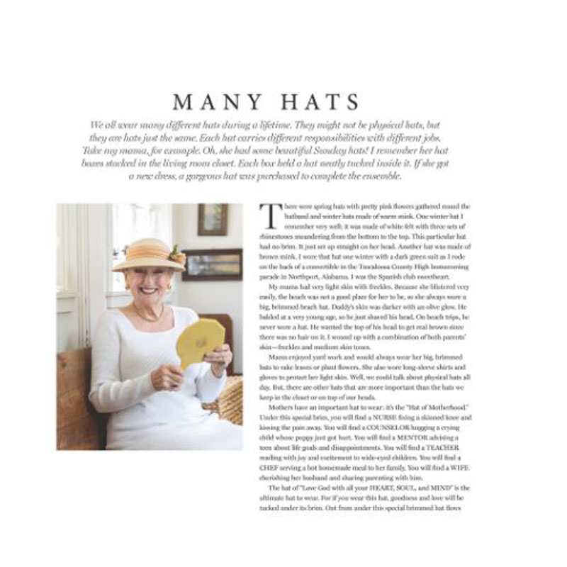 “My Southern roots go deep. As I look back through the mirror of life, memories rush my mind and heart with thoughts of my yesterdays: Red plowed dirt from Daddy’s tractor; running barefoot through cool, red clover; Mama’s Sunday dinners; playing badminton in the backyard with neighborhood children; making a playhouse on the clay bank and using a drink bottle with a yellow bitterweed for my bouquet. I remember snuggling with my own children as we would swing on the porch while listening to the thunderstorms and watching bright flashes of lightning. Now, I’m watching my grandbabies turn into young adults. I think of the Christmas movie, It’s a Wonderful Life, because it reminds me that it has truly been a wonderful life.”