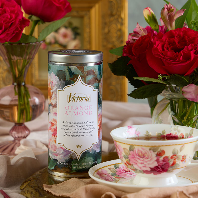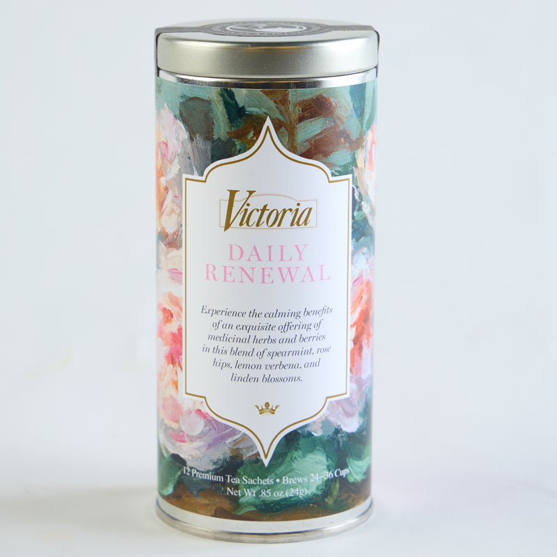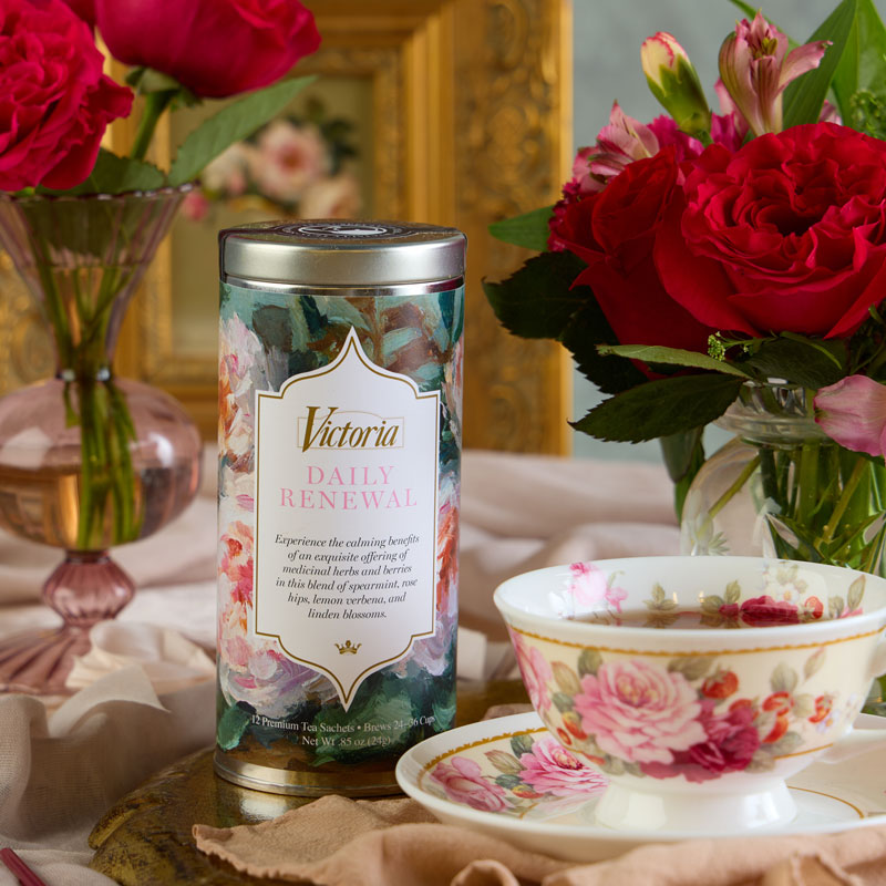 In this limited-time bundle, collect a unique patterned vintage teacup and saucer, along with a floral blend of our signature tea. Presented in a charmingly adorned reusable tin canister, your choice of either our Orange Almond, Elderberry Elan or Daily Renewal specialty tea will add a seasonal appeal to your moment of bliss, while the teacup and saucer will bring a sense of both surprise and delight to your taking of afternoon tea.