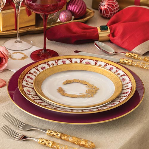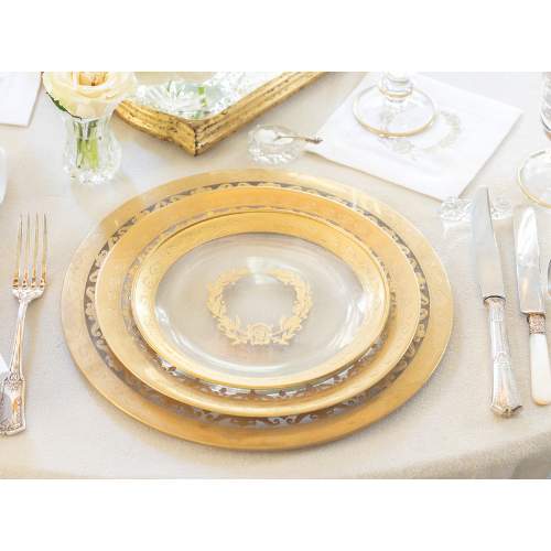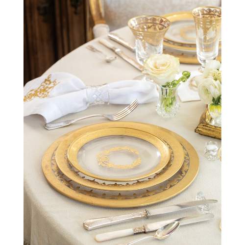 Elevate tablescapes for any occasion with our hand-etched glass salad plate, crafted exclusively for Victoria by Arte Italica. Each plate is adorned with a golden laurel wreath painted with luxurious flourishes of 24-karat gold. A stunning backdrop for showcasing holiday menus, teatime specialties, or for elevating everyday fare, these delicate plates blend timeless craftsmanship with an air of opulent sophistication.