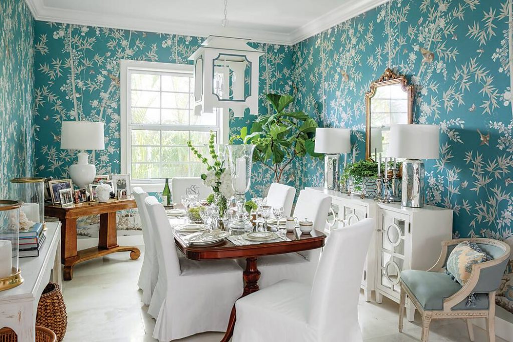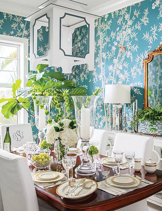 Against a bold chinoiserie backdrop, traditional elements blend with modish details and unexpected accents to bring this dining room a bit of whimsy. A hand-painted tole pagoda lantern harmonizes with the wallpaper’s Asian influence and adds to the refined open-air feel. Along with a sprawling fiddle-leaf fig, a luxe porcelain planter with a bamboo trellis pattern brimming with ivy, and other notes of fresh greenery, mirror the verdant landscape beyond. These lively features are balanced with classic furniture in crisp, clean whites and varied wood finishes.