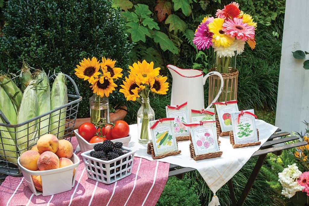 The most charming of all is a display of party tokens for guests—seed packets ready for planting—perched alongside just-picked tomatoes, sweet corn, ripe peaches, and luscious berries. Find the full menu on the next page.
