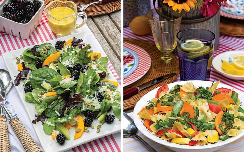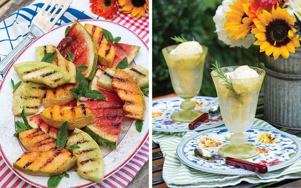 A summertime pasta with yellow squash, zucchini, tomatoes, and sugar snap peas anchors the menu, which brims with fruits and vegetables from the day’s harvest. Tangy Avocado-Mango Salad joins grilled melon tinged with mint and honey.